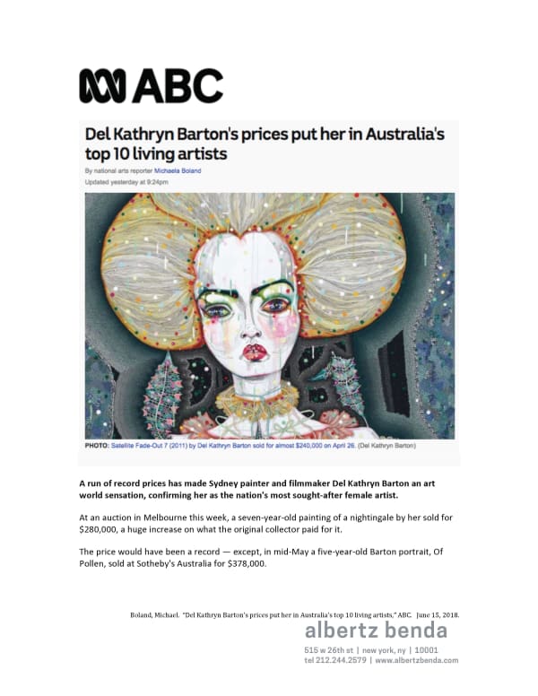 Born in 1972 in Sydney, Australia, Del Kathryn Barton has participated in many group exhibitions that include: UNTITLED, Art Basel, Miami (2018), Asia Now Paris Asian Art Fair, Paris (2018), The Archibald Prize (2018, 2013, 2011) Art Gallery of New South Wales, mad love, ARNDT, Singapore (2017); Hong Kong International Art Fair, Roslyn Oxley9/ARNDT, Hong Kong (2016); Like-ness, albertz benda, New York, USA (2016); Dark Heart, Adelaide Biennale of Australian Art, Adelaide, Australia (2014); Theatre of the World, Museum of Old and New Art, Tasmania, Australia (2012), Lightness and Gravity, Gallery of Modern Art, Brisbane, Australia (2012); Freehand: Recent Australian Drawing, Heide Museum of Modern Art, Melbourne, Australia (2010/11); 2009 Wynne Prize for Landscape, Art Gallery of New South Wales, Sydney, Australia (2009); Half a World Away: Drawings from Glasgow, Sao Paulo and Sydney, Hallwalls Contemporary Arts Centre, Buffalo, New York, USA (2002).