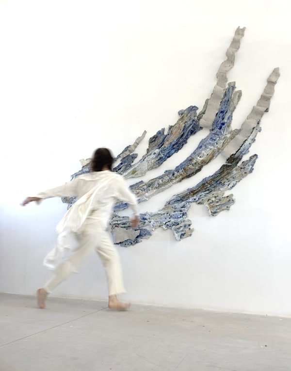 Settling in New Mexico heightened Ruais' sensitivity to the elements: wind, fire, water, and earth. New Mexico is known for its high winds in the spring, which, according to Ruais, were instrumental in “finding possibility in what feels like resistance”. Inspired by Joan Jonas’ early film "Wind," Ruais collaborates with these forces, performing what she calls "Wind Work," allowing her multi-sleeved garment to act like a weathervane, guiding the direction of her movements. The resulting sculptures, Traveling with the Wind, East and Traveling with the Wind, West, unfurl as sweeping forms, clay torn and flying loose like fabric —a testament to the wind's power to expose and reorient.