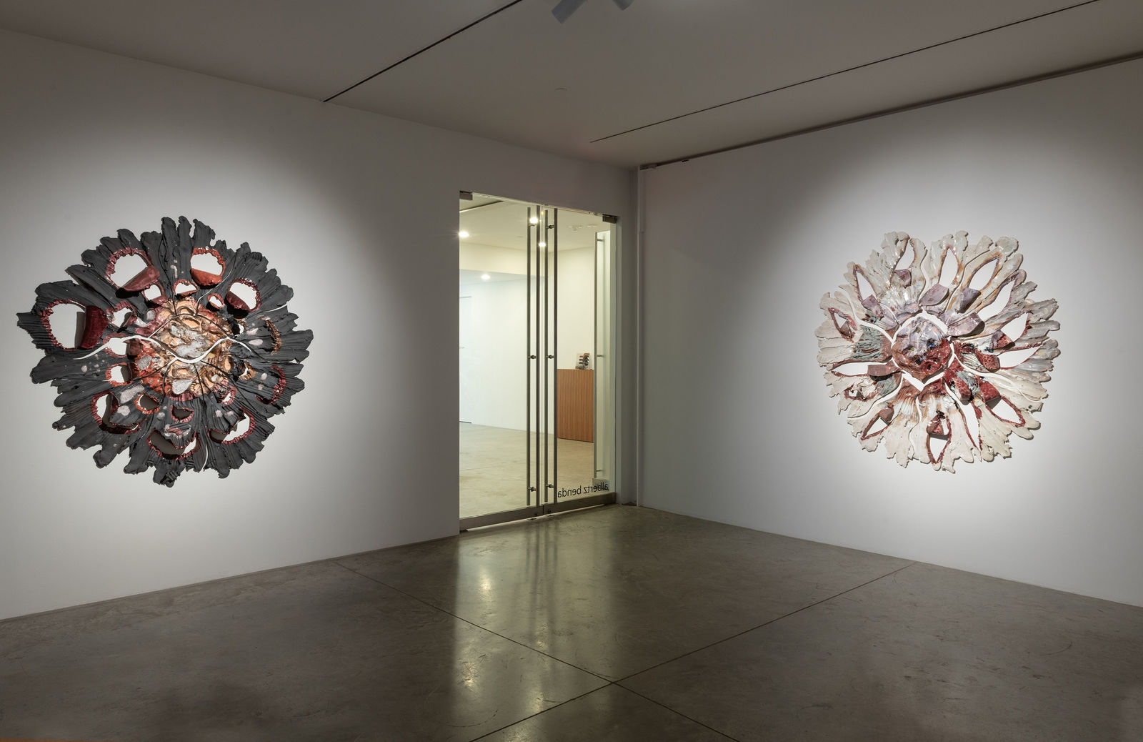 Several works in the show explore the effect of a gesture made with a tool: a knife's cut through clay. In Sharpening the Edge of a Knife on Visibility (Swapped Pieces of Her 130lbs) she slices through the clay, creating an arcing division between the illuminated and shadowed sections of a phasing moon. This cutting gesture echoes in other works like Petaling Inward, Slicing Outward where cuts birth forms that unfold and radiate from their centers. The ceramic surfaces, once concealed, emerge through red and pink glazed petals folding inward toward the sculpture's dense center. The knife’s incision stirs surgical and violent utterances as well as the artist’s impulse to articulate her investigation into the dualistic nature of selfhood and objecthood.