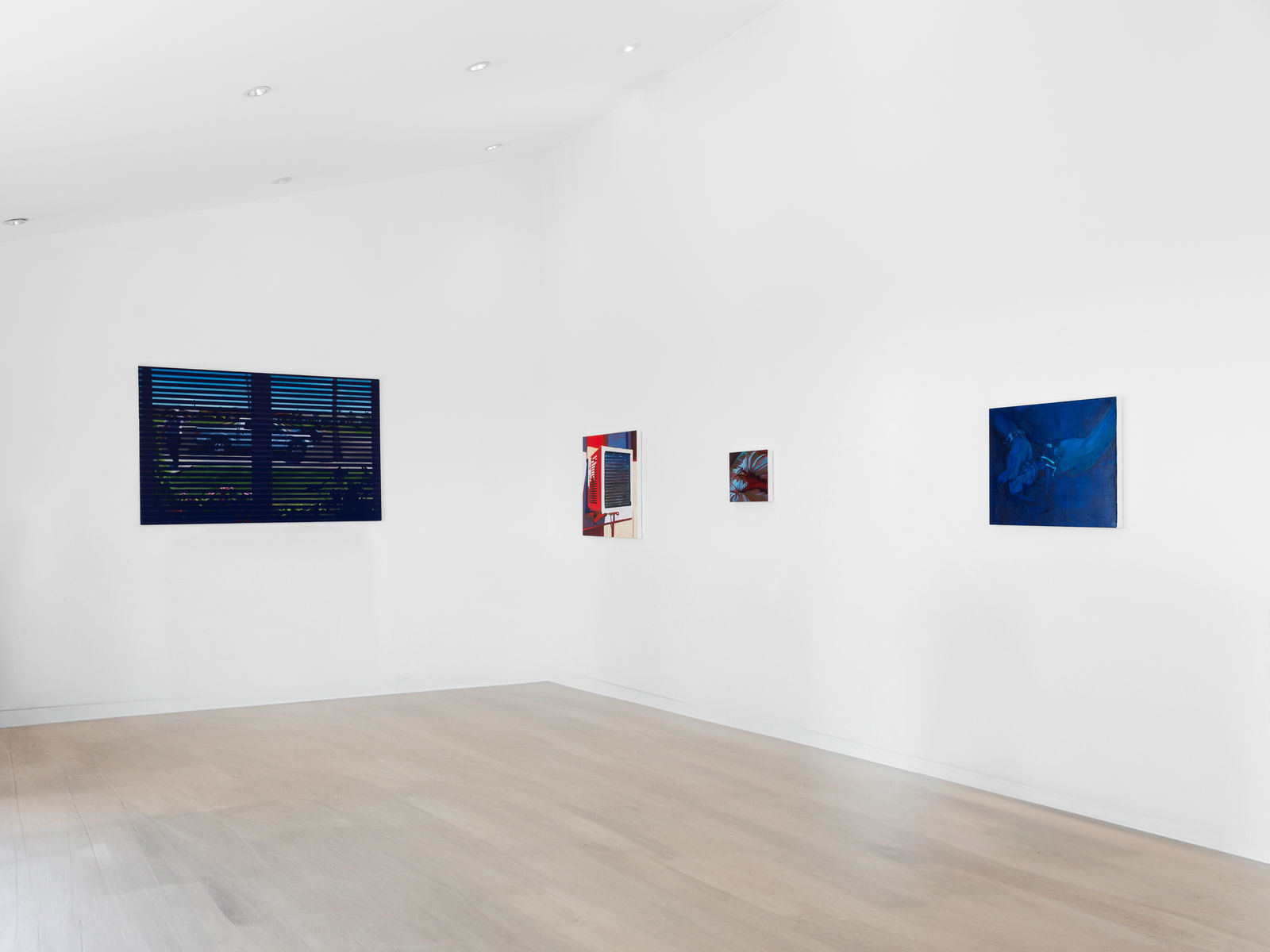 A suite of smaller canvases depict quiet moments of intimacy, observance, and punishment as witnessed within the home. We are given snapshots of actions without full context, only assumed intent. Subjects are blurred as if to deny their factual existence, living only in a private memory. The larger paintings situate amorphous shadowed figures in the rigid angular architecture of the home. The repetitious lines of window-blinds and vinyl siding hide physical and psychological invasions into this presumed space of sanctity; be they barking dogs, baleful neighbors, or obtrusive security lights. The lines of safety stack on lines of intrusion and what was once a home takes on the architecture of a cage.